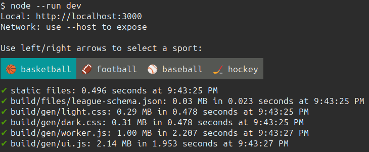 I also made another nice improvement to my dev script recently. As mentioned above, I have games for multiple sports all built from the same codebase. In dev mode I was using an environment variable to define the sport, like: