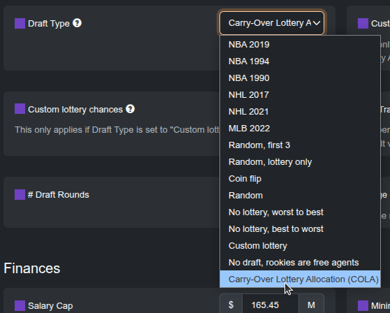 Tanking has been a big issue in the basketball world for many years, and it's probably never been more prominent than right now. This has led to many proposals to replace the draft lottery with a better system that discourages tanking. IMHO most of those ideas have serious flaws. The best one I've seen is called the Carry-Over Lottery Allocation (COLA), and now it's available in BBGM (and the other ZenGM games):